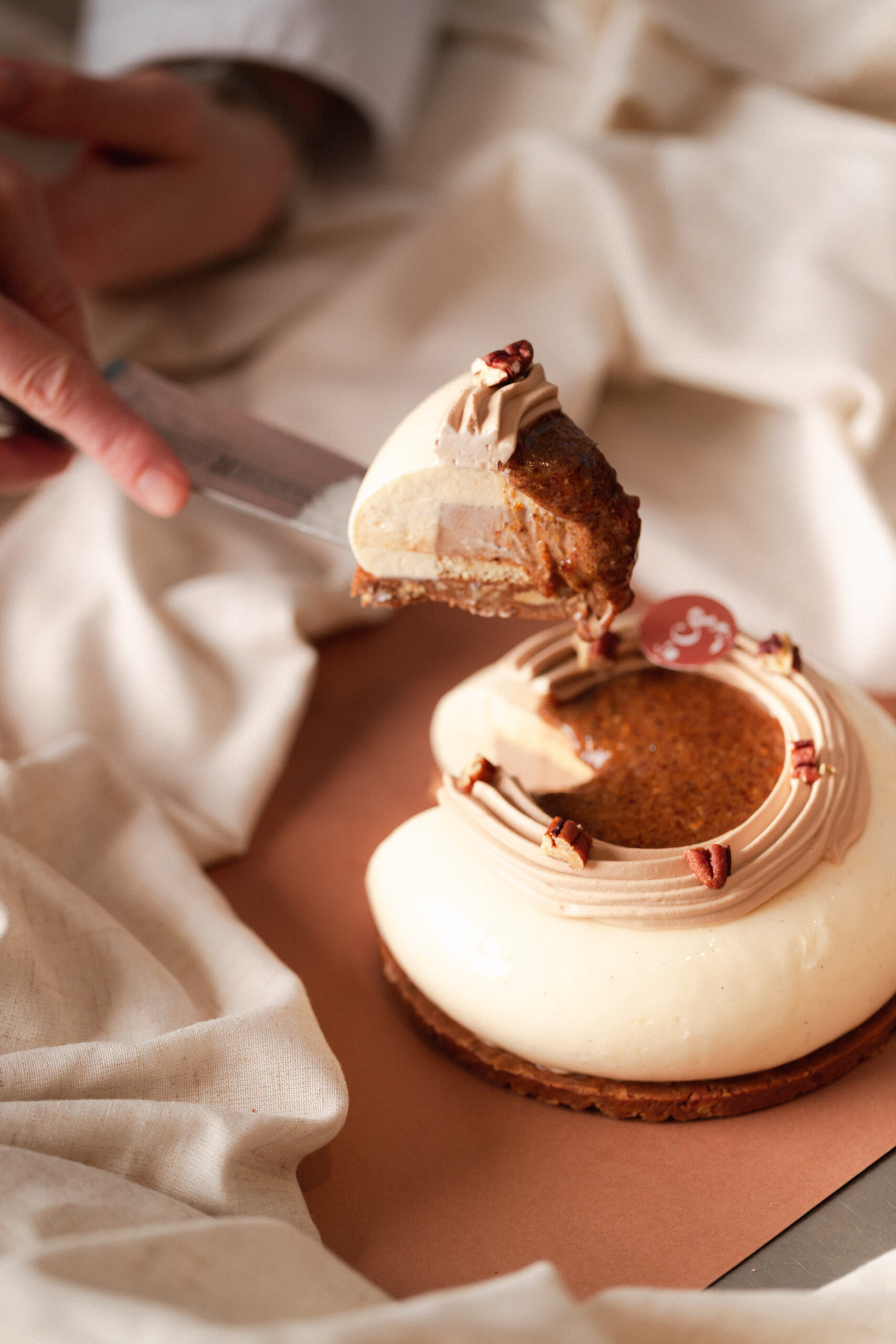 L’ensemble est sublimé par des éclats de noix de pécan et un praliné pécan intensément gourmand.