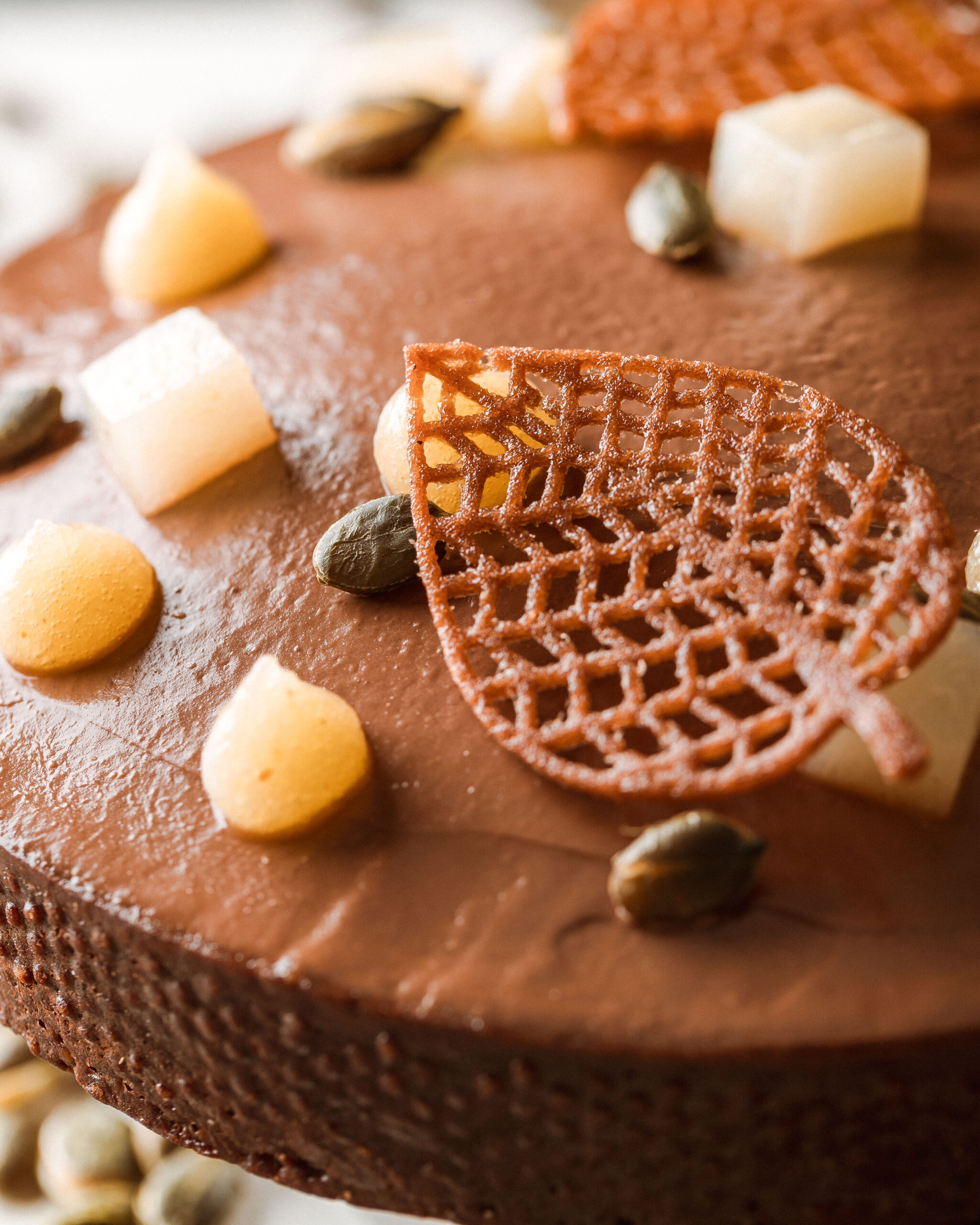 Découvrez ma tarte chocolat noir, poire et graine de courge,  une création gourmande et réconfortante qui célèbre les saveurs de la saison.