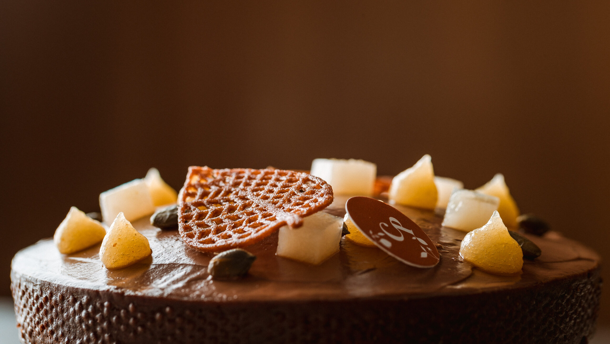 Cette tarte élégante associe un crémeux au chocolat noir intense à la douceur de la poire pochée infusée à la vanille , offrant un équilibre parfait entre richesse et subtilité. Un biscuit cacao apporte de la texture et de la puissance, et le praliné aux graines de courge ajoute une touche gourmande, croquante et originale, intensifiant ainsi l’expérience gustative.